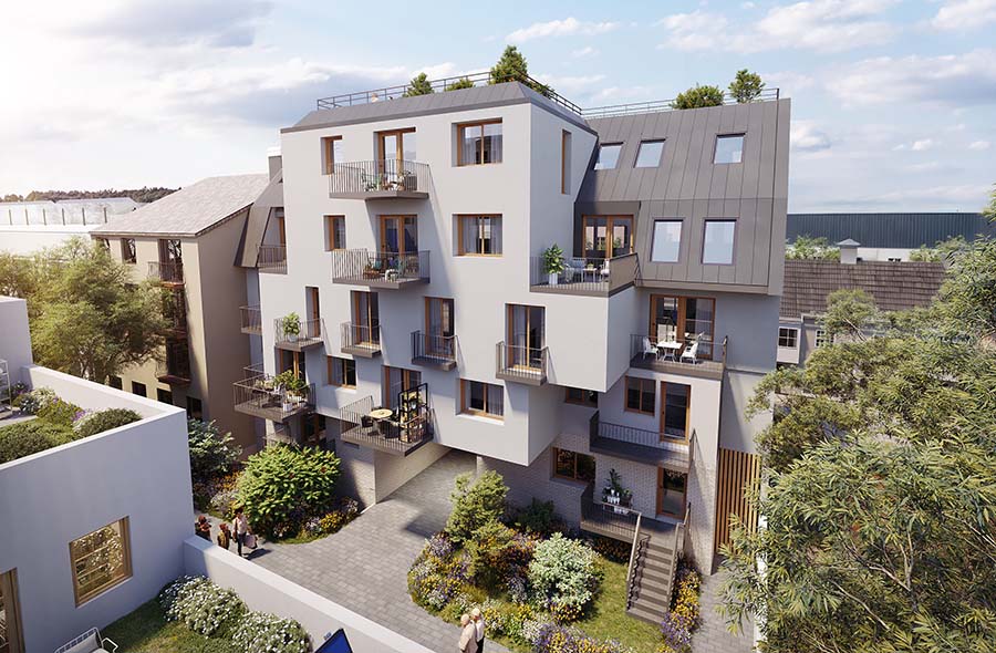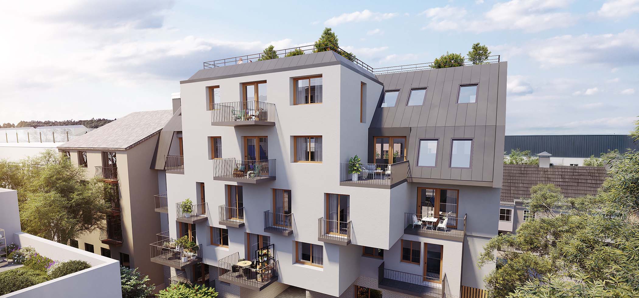 Der energieeffiziente Neubau (Energieeffizienzklasse A+, EH 40 mit QNG+) umfasst 19 moderne Eigentumswohnungen sowie zwei attraktive Gewerbeeinheiten im Erdgeschoss. Ein außergewöhnliches Townhouse mit zwei Dachterrassen bietet im Innenhof zusätzlichen Wohnraum mit viel Privatsphäre.