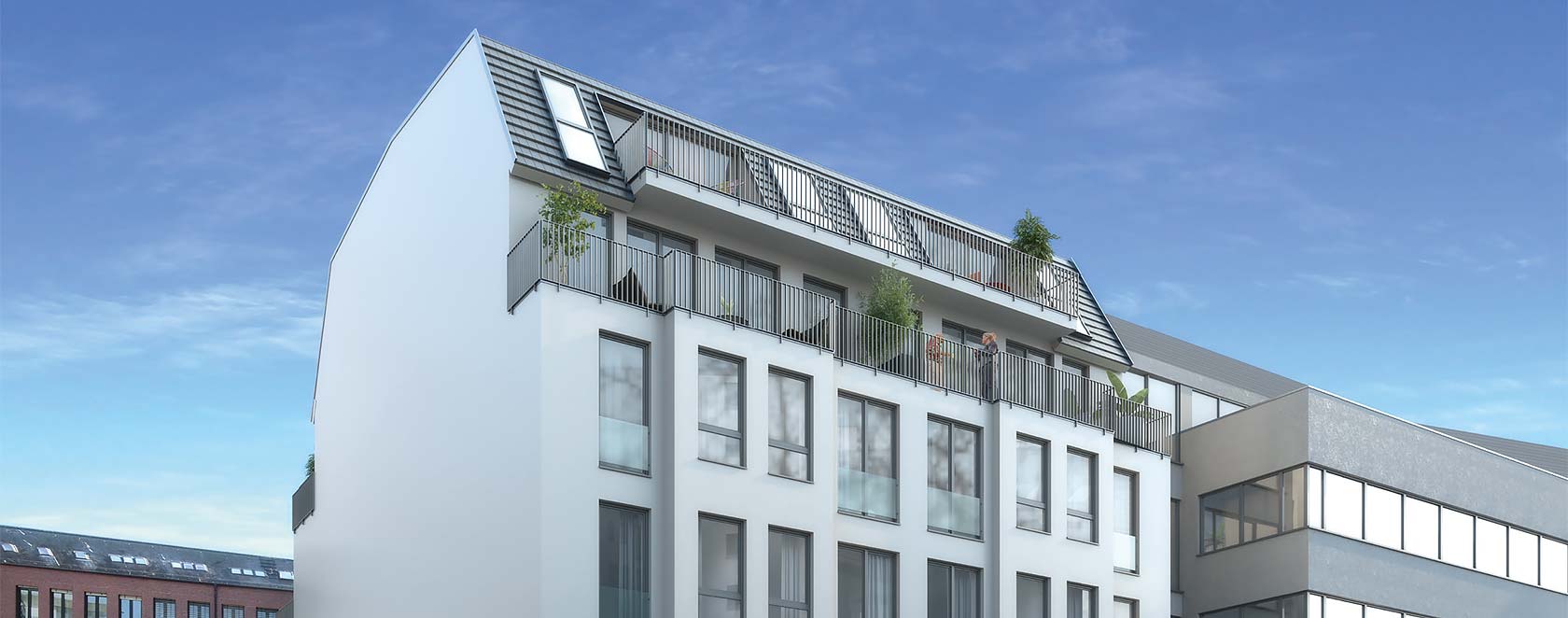 und eine Deckenhöhe von 2,60 m im 1. OG bis 4. OG bzw. bis zu 3,15 m in der Penthouse-Wohnung schaffen ein